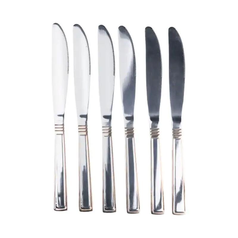 Набор столовых ножей из 6 штук с обрамлением, хром и золото — это элегантный и современный набор столовых приборов, который идеально подойдет для любого случая. Ножи изготовлены из высококачественной нержавеющей стали с хромированным и золотым покрытием, что делает их прочными и устойчивыми к ржавчине. Обрамление придает ножам нотку элегантности. Они безопасны для мытья в посудомоечной машине, что упрощает процесс очистки. Характеристики: Материал: нержавеющая сталь Покрытие: хромированное и золотое Окантовка: да Можно мыть в посудомоечной машине: да Размеры: Длина: 23 см Ширина: 2 см Вес: 55 граммов Преимущества: Высококачественная нержавеющая сталь с хромированным и золотым покрытием Окантовка для элегантности Возможность мытья в посудомоечной машине Уход: Мыть в посудомоечной машине или вручную с мягкими моющими средствами для сохранения качества.
