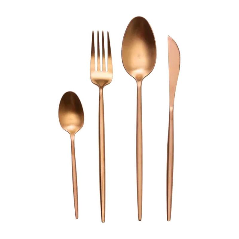 Набор столовых приборов бронзового цвета состоит из 24 предметов: 6 столовых ложек, 6 чайных ложек, 6 вилок и 6 столовых ножей. Каждый предмет имеет классический дизайн без лишних декоративных элементов, что делает их универсальными для ежедневного использования или сервировки праздничного стола. Столовые приборы имеют гладкую полированную поверхность, которая легко очищается и не задерживает загрязнения. Основные характеристики: Количество предметов в наборе: 24 шт.; Количество персон: 6; Материал: нержавеющая сталь; Упаковка: коробка; Размеры приборов: длина столового ножа: 21.5 см; длина столовой ложки: 22.5 см; длина столовой вилки: 22 см; длина чайной ложки: 14.5 см. Комплектация набора: столовый нож: 6 шт.; столовая ложка: 6 шт.; столовая вилка: 6 шт.; чайная ложка: 6 шт.. Материал изготовления - нержавеющая сталь, которая отличается прочностью, устойчивостью к коррозии и долговечностью. Лезвия ножей имеют заточенную кромку, что обеспечивает удобное нарезание продуктов. Вилки и ложки имеют эргономичную форму, что способствует комфортному удержанию в руке во время приема пищи. Все предметы набора можно мыть в посудомоечной машине без риска потери блеска или повреждения поверхности. Комплект поставляется в базовой упаковке, которая защищает приборы от механических повреждений во время транспортировки. Набор подходит для использования в домашних условиях, заведениях общественного питания или как вариант для временного жилья. Благодаря стандартным размерам и нейтральному дизайну эти столовые приборы легко сочетаются с различными стилями посуды и текстиля для сервировки стола.