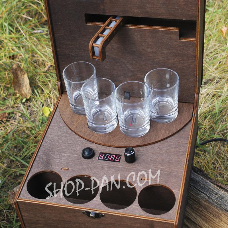 Функціональний механічний пристрій, призначений для дозування спиртного. Апарат здійснює розлив напою, кількість рідини, що наповнюватиме ємність, регулюється. Наливатор стане оригінальним подарунком для любителів ексклюзиву. Режими пристрою: атоматичний або ручний. Комплектація: наливатор шланга харчова USB-кабель 4 чарки гравірування на кришку наливатора Додатково можна придбати: гравірування на чарках - 50 грн / шт повербанк 5000 мА / 10000 мА