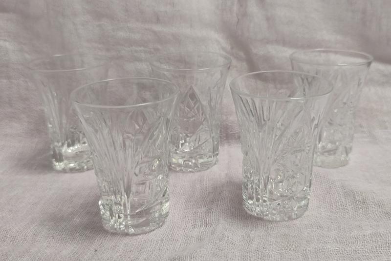 Рюмки хрустальные 5 штук, высота 8 см, об эм 0.1 мл в хорошем состоянии