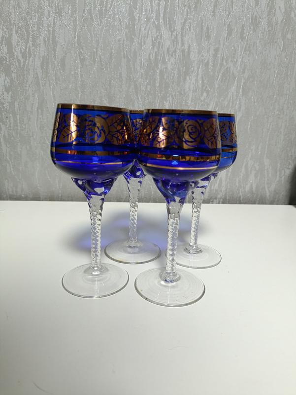 Продам вишуканий набір вінтажних рюмок (чарок) із насиченого кобальтового скла, виробництва Богемії (Чехословаччина). Ці предмети датуються приблизно 1970-ми роками і виконані з високоякісного кришталевого скла. Основні характеристики: Матеріал: Кобальтове скло/кришталь з ручним розписом або гравіюванням. Декор: Багатий золотий візерунок та обідок додають виробам особливої розкоші та шарму. Стан: Дуже хороший, сервантне зберігання, без сколів, тріщин чи пошкоджень. Кількість: В наявності 4 шт. (ідеально для невеликої колекції або вечірніх поседілок). Призначення: Підійдуть для міцних напоїв, лікерів або як декоративний елемент інтер'єру. Ці рюмки стануть чудовим придбанням для колекціонерів вінтажного посуду або оригінальним подарунком для поціновувачів красивого та рідкісного скла. Зверніть увагу: рекомендовано ручне миття, щоб зберегти цілісність позолоти. Розміри - висота 13,5 см. діаметр 5 см.