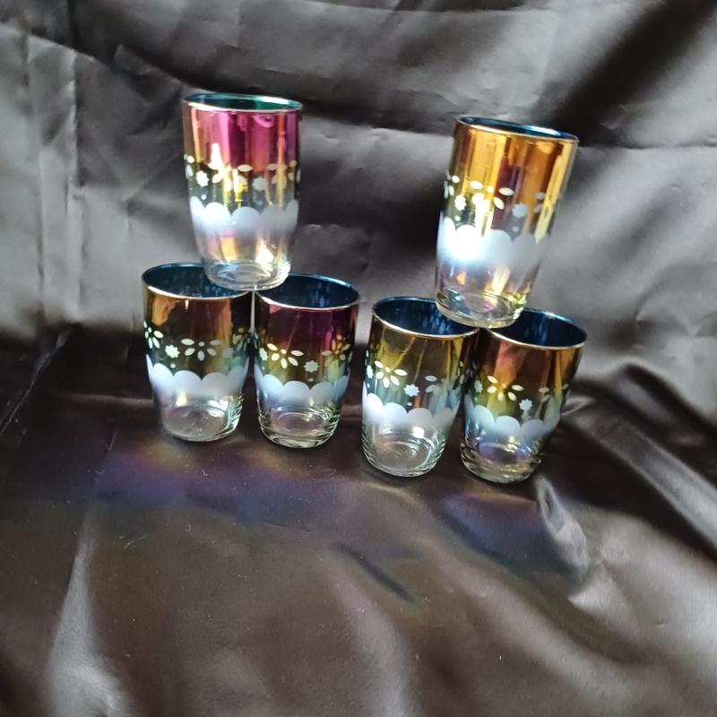 Винтажный набор стаканов из тонкого стекла. Высота 11см.Присутствующие незначительные, фабричные недостатки напыления.