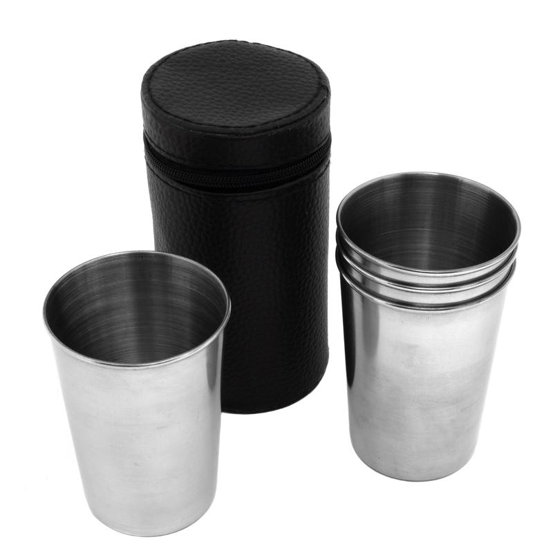 Об'єм – 180 мл; Висота – 82 мм; Діаметр верхній – 59 мм; Вага набору – 215 г; Матеріал – харчова нержавіюча сталь; Кількість у наборі – 4 шт. У комплекті з чохлом.