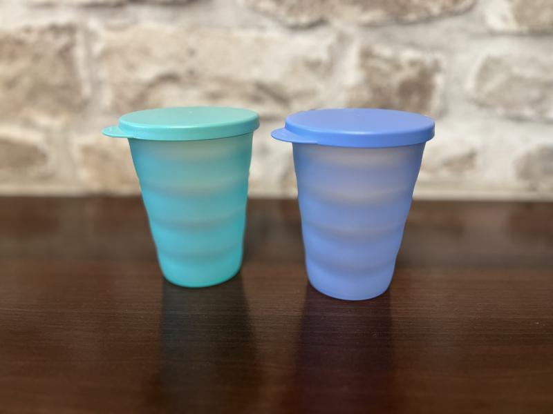 Набір склянок «Чарівність» 330мл, 2шт Tupperware Склянки мають герметичні кришки непроливайки та оксамитову поверхню, що мінімізує появу дрібних подряпин. Чудово підійдуть для пікніку, або для дітей, бо ніколи не розібʼються. Виготовлені із еко-полімеру, що абсолютно безпечний для людей.