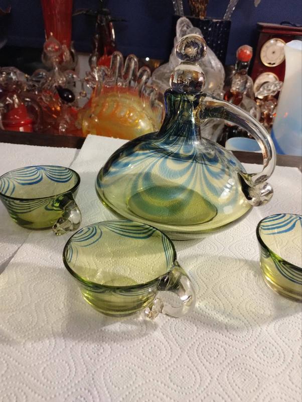 Набор для вина, графин (кушин, штоф) и три чашки. Гутное стекло. Винтаж. Гутное стекло, тяжелые, стильное украшение для дома. Прекрасный подарок для ценителей гутного стекла. Произведено в стеклоцехе Львовской керамико-скульптурной фабрики? SKLO_NABIR_VINO_0002