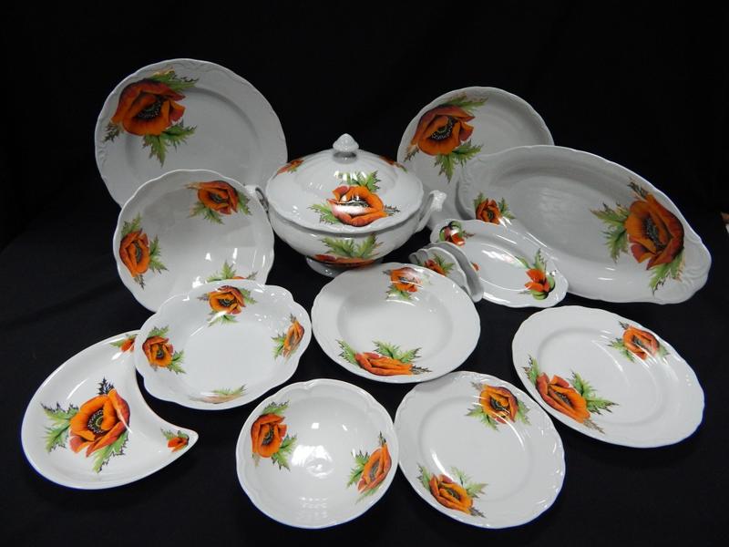 Сервиз столовый "Маки" Коростенский фарфор состоит из 33 предметов на 6 персон рисунок пестрение золотом Комплектация Ваза суповая 4000 см3 - 1шт Блюдо круглое 300 мм - 1шт Сухарница 275 мм - 1шт Блюдо овальное 405 мм - 1шт Селедочник 250 мм - 1шт Салатник 1000 см3 - 1шт Полумесяц 300 см3 -1шт Салфетница - 1шт Ваза для фруктов1100 см3 - 1шт Тарелка мелкая 240 мм - 6шт Тарелка мелкая 200 мм - 6шт Салатник 480 см3 - 6шт Тарелка глубокая 240 мм - 6шт