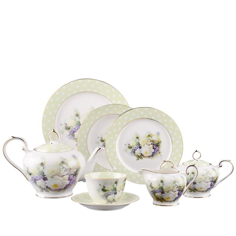 Цей чайно-столовий сервіз на шість персон виготовлений з порцеляни. Матеріал відрізняється міцністю, механічною і термічною стійкістю, стійкістю до різних кислот. Фарфор виготовляють шляхом високотемпературного обпалення суміші каоліну, кварцу, польового шпату і глини. Сервіз декорований ніжним вишуканим орнаментом. М'який зелений фон на блюдцях і кришках прикрашений великим білим горошком. У центрі зображений реалістичний натюрморт з чайної троянди та бузку. Всі кольори композиції вдало поєднуються між собою. Перед подачею на стіл гарячих страв порцеляновий посуд рекомендується нагріти, тільки не в духовці. Найкраще просто потримати його в гарячій воді кілька хвилин, а потім відразу витерти насухо. Щоб не пошкодити малюнок, сервіз з порцеляни не рекомендується мити в посудомийній машині. Його потрібно мити вручну в теплій воді, без абразивних миючих засобів. У наборі 35 предметів: 1. Чайна чашка, об'єм 200 мл - 6 шт. 2. Блюдце, діаметр - 15,5 см - 6 шт. 3. Чайник з кришкою, об'єм 1200 мл - 1 + 1 шт. 4. Цукорниця з кришкою - 1 + 1 шт. 5. Молочник, об'єм 200 мл - 1 шт. 6. Тарілка, діаметр 20 см - 6 шт. 7. Тарілка, діаметр 25 см - 6 шт. 8. Тарілка глибока, діаметр 20 см - 6 шт.