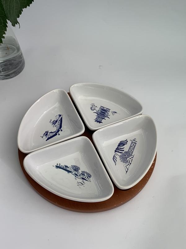 Закуски ringtons quiarter willow pattern и деревянные лоток. фарфоровый сервировочный подн...
