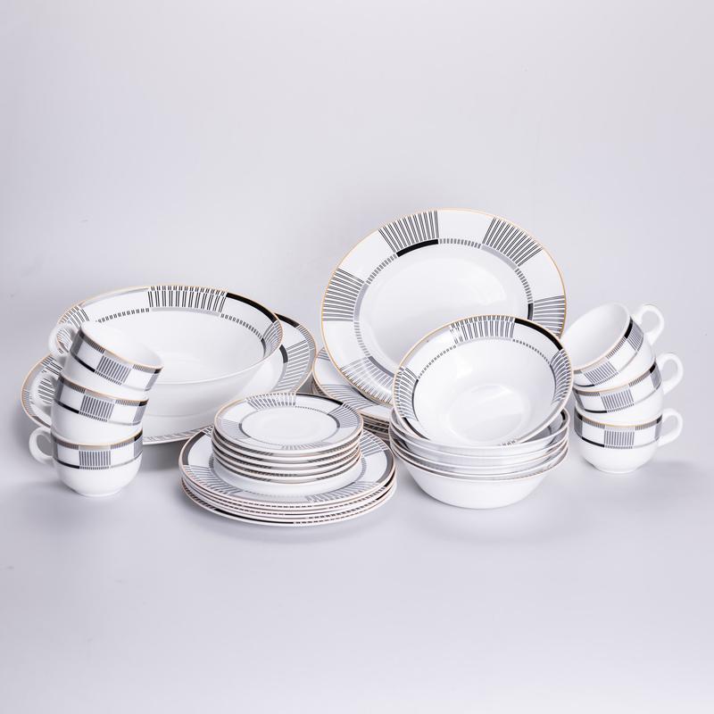 Столовый сервиз Geometry из высококачественного фарфора -- это гармоничное сочетание изысканной элегантности и практичности. Такой набор создан для того, чтобы превратить каждую трапезу в особенное событие: от ежедневных семейных обедов до торжественных ужинов. Утонченный геометрический узор в комбинации с золотой окантовкой придает сервизу современный и в то же время классический вид, который прекрасно впишется в любой интерьер. Сервиз станет отличным подарком к празднику и будет удобен в повседневном использовании. Он подходит для посудомоечной машины и микроволновой печи, что значительно облегчает уход. Состав сервиза: • суповая тарелка: 6 шт.; • десертная тарелка: 6 шт.; • подставная тарелка: 6 шт.; • блюдце: 6 шт.; • чашка: 6 шт.; • салатница: 1 шт.; • блюдо: 1 шт. Характеристики столового набора: • материал: фарфор; • количество предметов: 32 шт.; • объем чашки: 300 мл; • объем суповой тарелки: 400 мл; • объем салатницы: 1,4 л; • размеры: 35×26; 25; 23; 20; 17; 14; 8,5 см; • высота: 7; 6,5; 5; 3; 1,5 см; • вес набора: 10,4 кг.