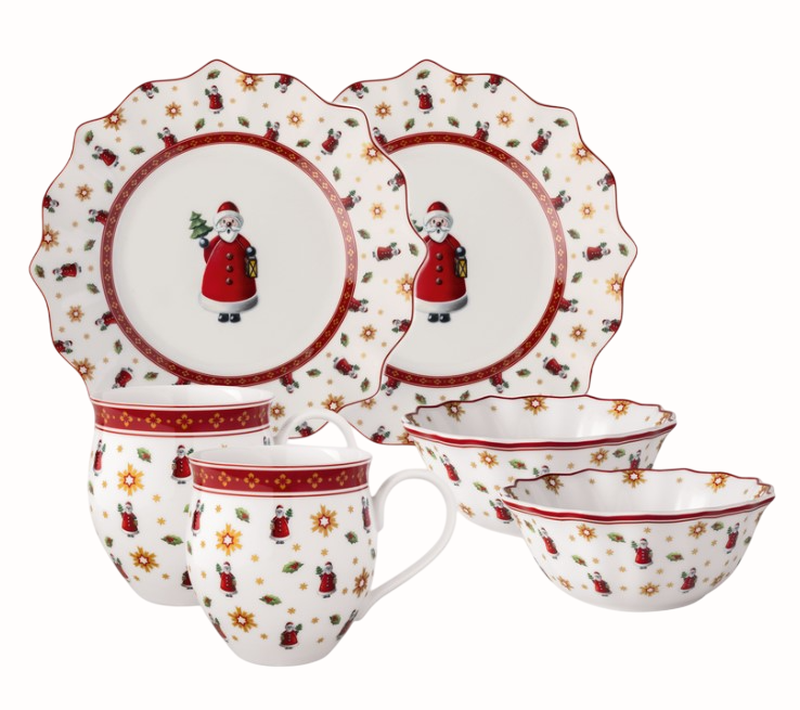 Набор посуды подарочная новогодняя Villeroy & Boch Toy's Delight 6 предметов 2 салатницы Toy's Delight, 550 мл; 2 тарелки для завтрака/десерта Toy's Delight, Ø24,4 см; 2 кружки Toy's Delight, 390 мл. Материал: фарфор премиум класса; Форма: кругла; Инструкции по уходу: рекомендуется ручная мойка; Можно использовать в микроволновой печи: да; Длина: 360 мм; Ширина: 250 мм; Высота: 140 мм; Вес: 2250 г; На сколько людей: 2. Лимитированная серия 2025 года. Хороший дизайн и практичность: этот набор для идеально подходит для роскошной сервировки завтрака. В набор входят: 2 салатницы/глубокие тарелки Toy's Delight (550 мл), 2 тарелки для завтрака/десерта Toy's Delight (Ø24,4 см) и 2 кружки Toy's Delight (390 мл) Создано для длительного срока службы: высококачественный используемый фарфор отличается высокой прочностью и поэтому особенно долговечен. Комбиналенность: круглый набор для завтрака можно легко сочетать с другими предметами из коллекции Toy’s Delight.