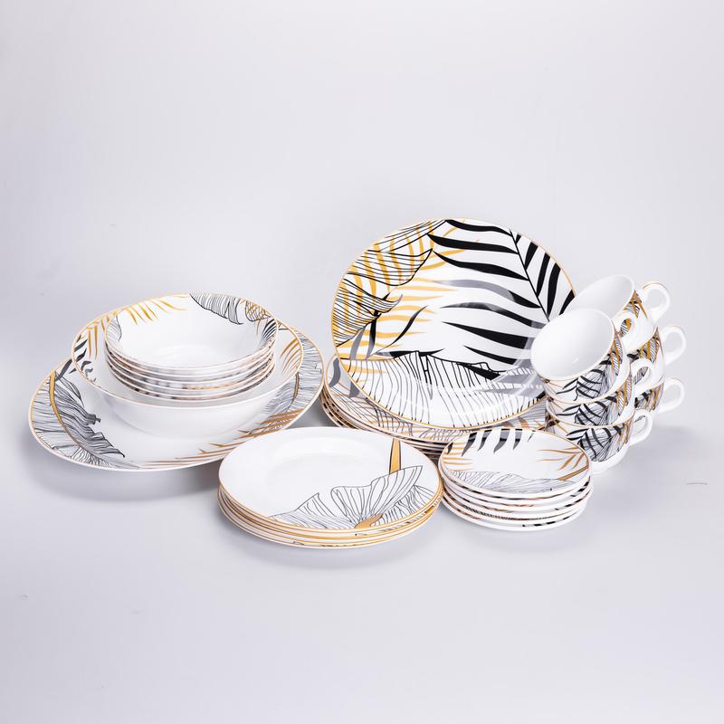 Набор столовой посуды на 6 персон -- это не просто элементы сервировки, а способ превратить каждую трапезу в эстетическое удовольствие. Выполненный из прочного фарфора, он сочетает в себе изящество классической посуды и современный декоративный стиль. Сервиз одинаково гармонично смотрится как в повседневной кухонной атмосфере, так и на праздничном столе. Он подчеркивает важность момента и завершает композицию интерьера. Особое внимание уделено не только внешнему оформлению, но и практичности: фарфор отличается высокой прочностью, гладкой блестящей глазурью, а декоративные элементы выдерживают регулярное использование при правильном уходе. Такой комплект станет удачным выбором для дома и прекрасным подарком, оставляющим приятное впечатление. Состав столового сервиза: • глубокая тарелка: 6 шт.; • десертная тарелка: 6 шт.; • подставная тарелка: 6 шт.; • блюдце: 6 шт.; • чашка: 6 шт.; • салатница: 1 шт.; • блюдо: 1 шт. Характеристики набора: • материал: фарфор; • количество предметов: 32 шт.; • объем чашки: 200 мл; • объем суповой тарелки: 400 мл; • объем салатницы: 1,4 л; • размеры: 35×26; 25; 23; 20; 17; 14; 8,5 см; • высота: 7; 6,5; 5; 3; 1,5 см; • вес набора: 10,4 кг.