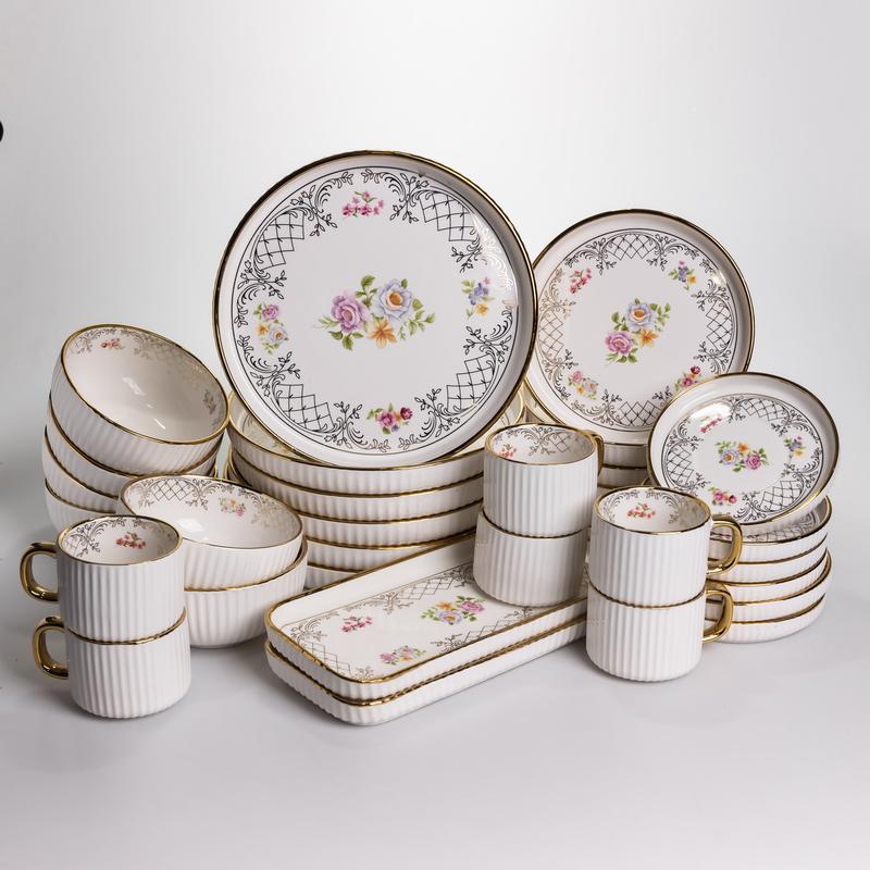 Идеальное решение для торжественной сервировки! Этот большой столовый сервиз из 32 предметов, рассчитанный на 6 персон, сочетает в себе безупречное качество фарфора и элегантный классический дизайн. Набор включает полный комплект посуды для сервировки, а также два больших блюда для подачи: Обедные тарелки (для основных блюд). Десертные тарелки (для закусок и салатов). Глубокие пиалы (для супов, боулов, каш). Чайные пары (чашка + блюдце). Два прямоугольных блюда (для подачи нарезки, рыбы, канапе). Благодаря прочности фарфора, этот сервиз не только красивый, но и долговечный, сохраняя свой блеск и вид на протяжении многих лет. Это отличный, статуcный подарок на любой семейный праздник. Основные характеристики столового сервиза из фарфора: Тип: Столовый сервиз; Количество персон: 6; Количество предметов: 32; Материал: Фарфор; Цвет: Белый, с черным и золотым ободком; Вес набора: 14.8 кг; Тарелка обеденная: 6 шт. (Ø 25 см); Тарелка десертная: 6 шт. (Ø 20 см); Пиала (супов/салатная): 6 шт. (Ø 14 см, Объем 500 мл); Чашка: 6 шт. (Ø 8 см, Объем 300 мл); Блюдце для чашки: 6 шт. (Ø 14 см, допустим); Блюдо сервировочное: 2 шт. (30 x 13 см). Сервиз изготовлен из высококачественного белоснежного фарфора, который подчеркивает чистоту и свежесть блюд. Каждый предмет украшен двойным контрастным ободком: черным и золотым. Такой геометрический кант придает набору изысканный, но при этом сдержанный вид, идеально подходя как для праздничного ужина, так и для ежедневного использования.