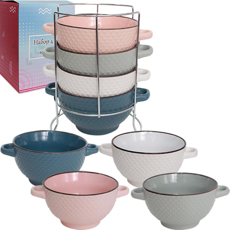 Набор бульонниц на стойке 680 мл S&T; Dots 054-04-08 Набор на металлической стойке. В наборе 4 керамические миски 680 мл разных цветов - темный синий, кремовый, розовый и серый. Металлическая хромированная подставка устойчива к коррозии. Набор упакован в фирменную коробку. Характеристика: Вид: Бульонница Тип поставки: Набор Материал: Керамика Объем: 680 мл Форма: Круглая Комплектация: 4 бульонници, подставка