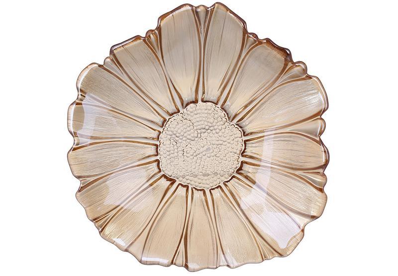 Кілька примірників у наявності Блюдо скляне Flower D28*7см, колір - амбер Продається гуртом та в роздріб з доставкою по Україні Форма: Фігурна Матеріал: Скло Підходить для миття в посудомийній машині: Так Зберігання в холодильнику: Так Країна виробник: Україна Багаторівнева: Ні
