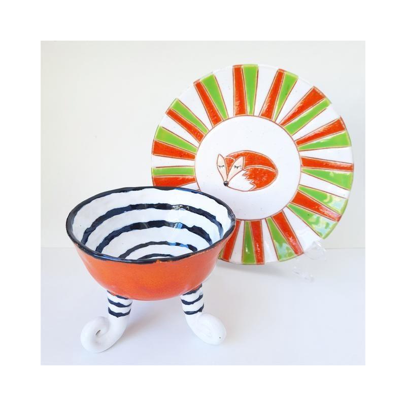 Тарілка з лисою 17 см + піала на ніжках 250мл Ручна ліпка та розпис, шамот, поливи Тильна сторона тарілочки помолочена та провощена