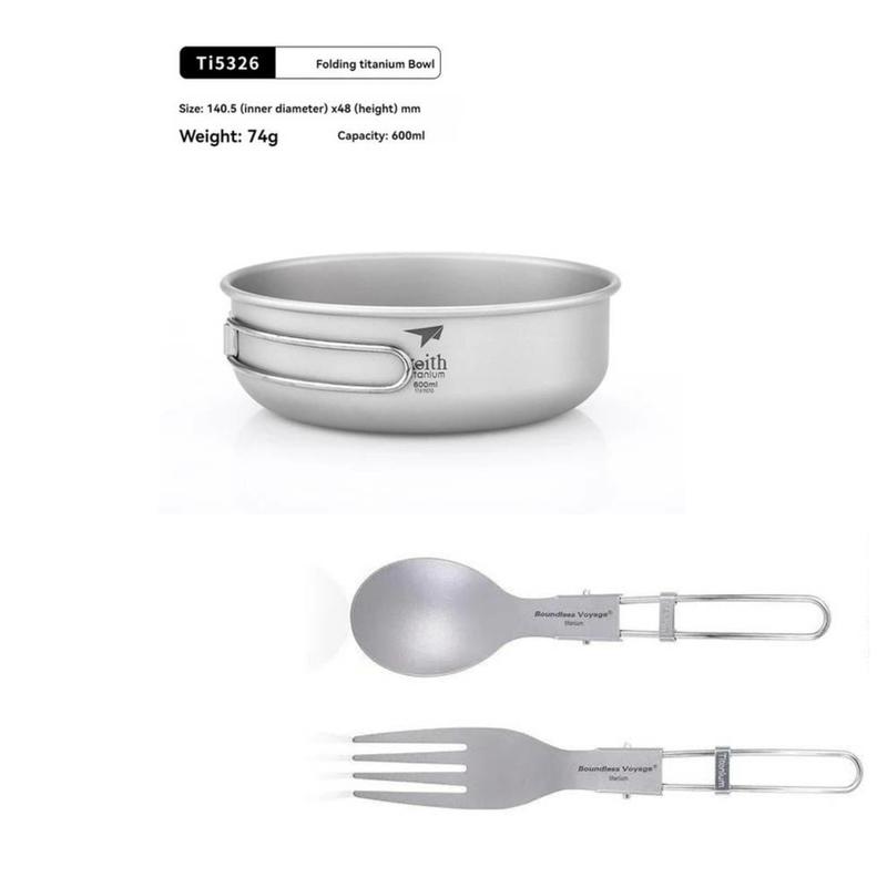 Тарелка из титана Keith 600мл + ложка, вилка Тарелка из титана Keith 600мл Производитель: Keith Цвет: титан (оригинальный цвет). Материал: титан Размер: 145.5*48мм Вес: 74г Емкость: 600мл Набор столовых приборов из титана: ложка, вилка Boundless Voyage + чехол Характеристики: Производитель: Boundless Voyage Тип: Титановый набор столовых приборов Материал: титан Размер: вилка: 165*26 мм/ложка: 150*38 мм Вес: вилка: 15г / ложка: 18г Легкость и компактность особенно ценится во время долгих путешествий и походов, когда каждый грамм имеет значение! Почему именно титан? Титан - очень твердый металл. Он в 12 раз тверже алюминия, в 4 раза - железа и меди. Титан - легкий и прочный металл. Он в три раза легче стали, почти вдвое легче железа и лишь в полтора раза тяжелее алюминия. А вот в прочности титан не уступает стали: он в полтора раза прочнее. Титан - не ржавеет. Посуда хорошо держит тепло и не вступает в реакцию с едой и напитками, а горелки из титана очень надежны и долговечны, если не потеряете - передадите по наследству:) В наличии большой выбор: наборы посуды, кастрюли, котелки, сковородки, чайники, чашки, рюмки, стаканы, тарелки, фильтры для чая и кофе, столовые приборы, фляги и бутылки, термосы, газовые горелки, спиртовки, решетки гриль, колышки, лопатки, щепочницы из титана разных размеров. Поэтому, если именно этот товар Вам не подходит, напишите в любой мессенджер или на сайте и я пришлю Вам ссылку где есть весь перечень изделий из титана, и возможно подскажу что лучше для ваших нужд. Приятных покупок :)