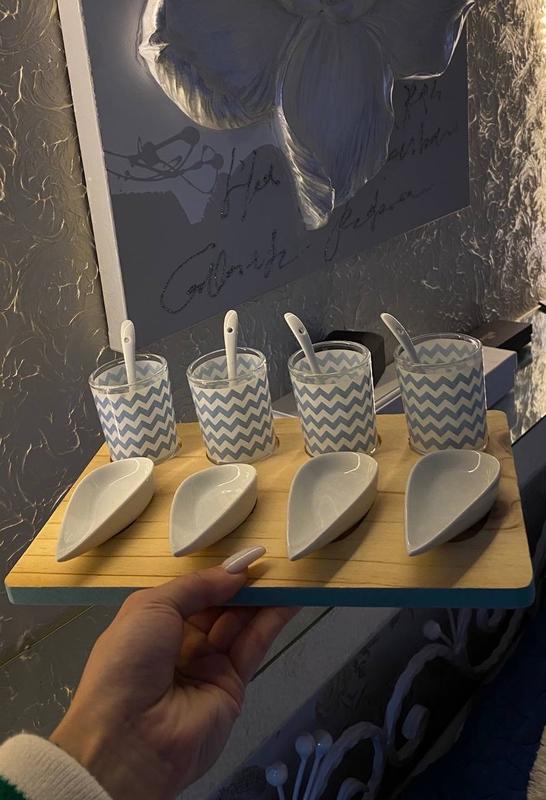 Набор для подачи десерта -13 предметов на деревянной подставке.