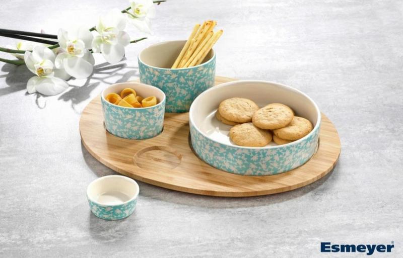 Сервировочный набор посуды Snack-Set KORFU - 4 чаши из глянцевой керамики с декором, удобная роспись бирюзовым/кремовым. Бамбуковый поднос. Размеры чаш: большая круглая миска - диаметр 16,0 см маленька кругла миска - 6,0 см. большая овальная чаша - 10,0 см маленькая овальная миска - размеры 8,0 х 6,0 см. Керамические миски можно использовать в духовке, микроволновке и можно мыть в посудомоечной машине. Размеры подноса из бамбукового дерева 33 x 25 x 2,5 см.