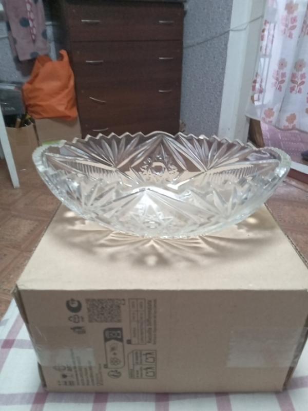 большая,массивная,натуральный хрусталь,цела,все хорошо, но есть следы использования...на дне полей.царапинка и чуточку загрязнена...требубы почистить