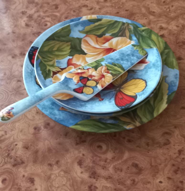 Цена за набор. Набор из 3 тарелок и лопатки для торта с ярким цветочным орнаментом. Идеально подойдет для сервировки праздничного стола или украшения интерьера кухни. 🌸Большая тарелка 26 см. 🌸2 меньшие тарелки 20 см. 🌸26 см лопатка.