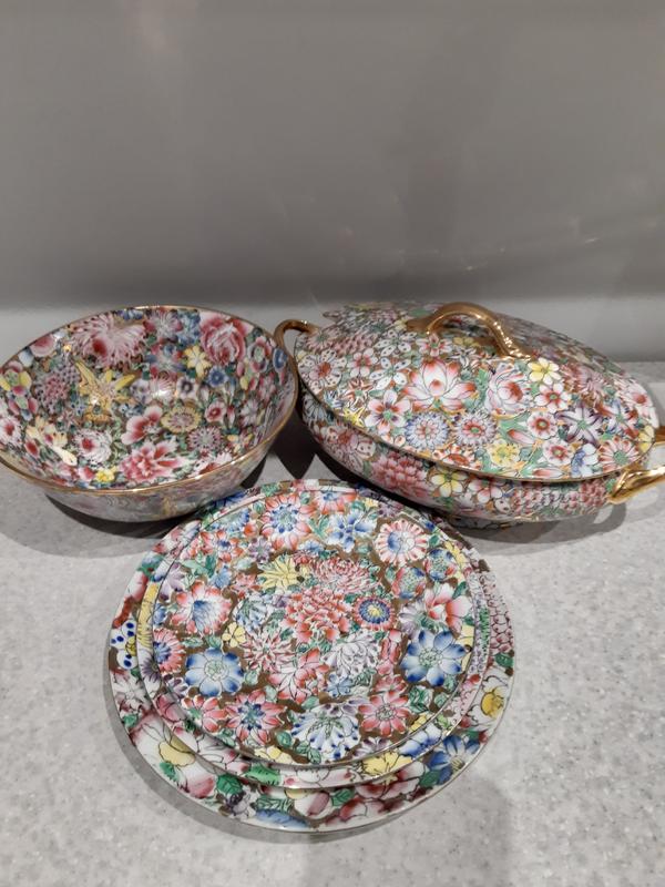 Дуже гарний набір із 4-х тарілок і супниці.Розміри на фото.Ідеальний стан.Насичені,яскраві кольори.Малюнок нанесений вручну.Багато позолоти.Виробництво Китай.Макао.