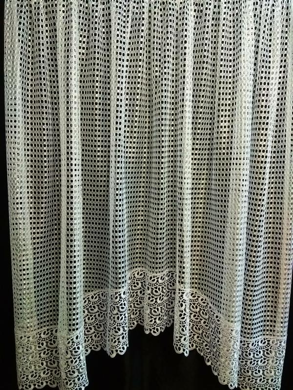 Готовая занавеска. Сетка белого (молочного) цвета. Украсит окно на кухне, на балконе, коридоре. Ширина по ленте 3 м. Высота по краям 1.8 м, по центру 1.6 м. Ширина кружева 0.30 см. Возможна пошив по вашим размерам.
