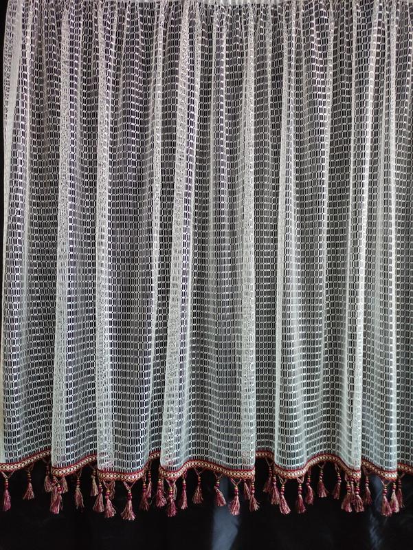 Сетка молочного цвета. Низ занавески украшает бахрома бордового цвета. Ширина занавески по ровной ленте 2.95 м Высота 1.6 м. Занавеска полностью готова с пришитой лентой под любые крючки.
