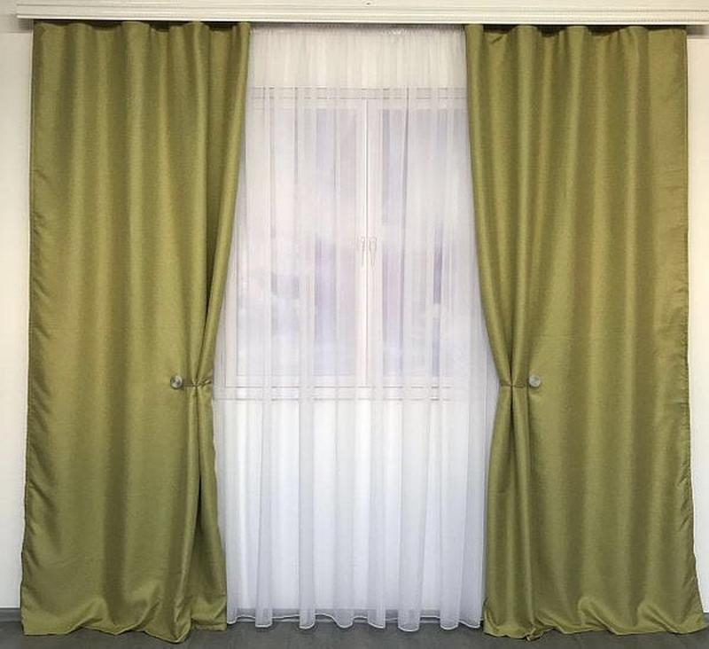 Готовый комплект штор из мешковины 150х270 см с тюлем 400х270 см на тесьме. цвет оливковый