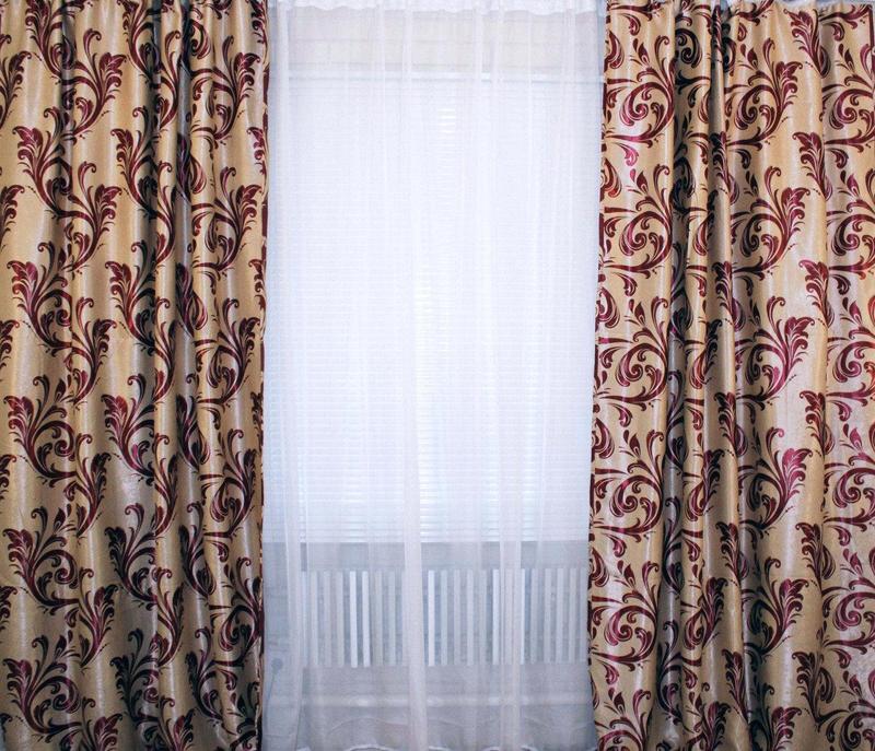 Комплект готових штор тканини блекаут з візерунком. Ширина кожної штори 1.5м, можемо пошити по Ваших замірах. Тканина: блекаут, двухстороння Колір : бежевий фон з бордовим візерунком. Висоту зробим по ваших замірах, але не більше 2.75см Интернет магазин " Чемодан текстиля" предлагает большой выбор товаров по низкой цене. Вы можете перейти по ссылке на наш сайт и посмотреть весь ассортимент наших товаров ************************** Если вам нравится эта модель, но нужно другие размеры или цвет, обращайтесь по телефонам : +38********** +38**********, каждый день.