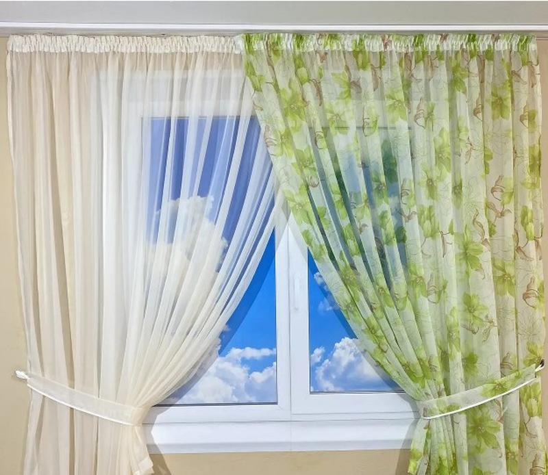 Шторки на кухню з квітковим принтом. колір салатовий з кремовим
