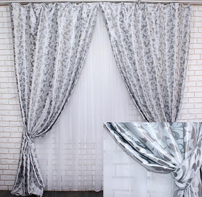 Комплект готових штор тканини блекаут з візерунком. Ширина кожної штори 1.5м, можемо пошити по Ваших замірах. Тканина: блекаут, двухстороння Колір: сірий з срібним. Висота : 2.75см Інтернет магазин "Чемодан текстилю" пропонує великий вибір готових штор, фіранок на кухню, балкон, а також тюлі та гардини за привабливою ціною. Весь асортимент Ви можете подивитись на нашому сайті за посиланням https://ch- *************** Якщо вам подобається ця модель, але потрібно інші розміри або колір, звертайтеся за телефоном ********** або **********.