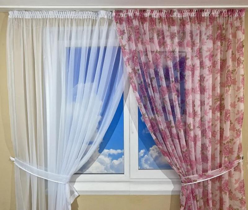 Шторки на кухню з квітковим принтом. колір рожевий з білим