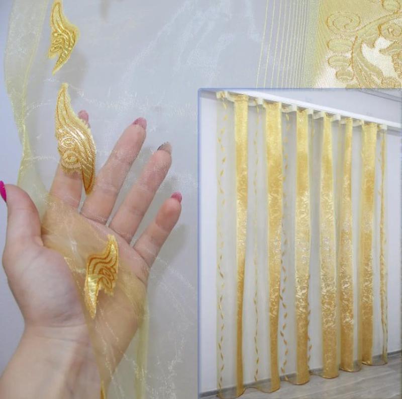 Тюль органза з нейлоновою вишивкою. колір напівпрозорий з золотистим