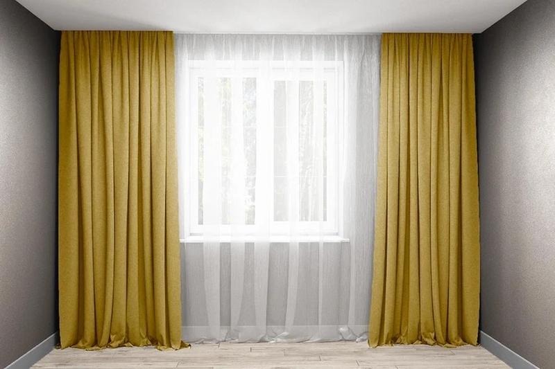 Полностью готовое изделие. Цена указана за изделие с учётом набора ткани, фурнитуры и работы. В наборе 2 шт. - Длина - 240 см; - Ширина - 200 см; Сверху пришита хлопковая шторная тесьма, шириной 6 см.