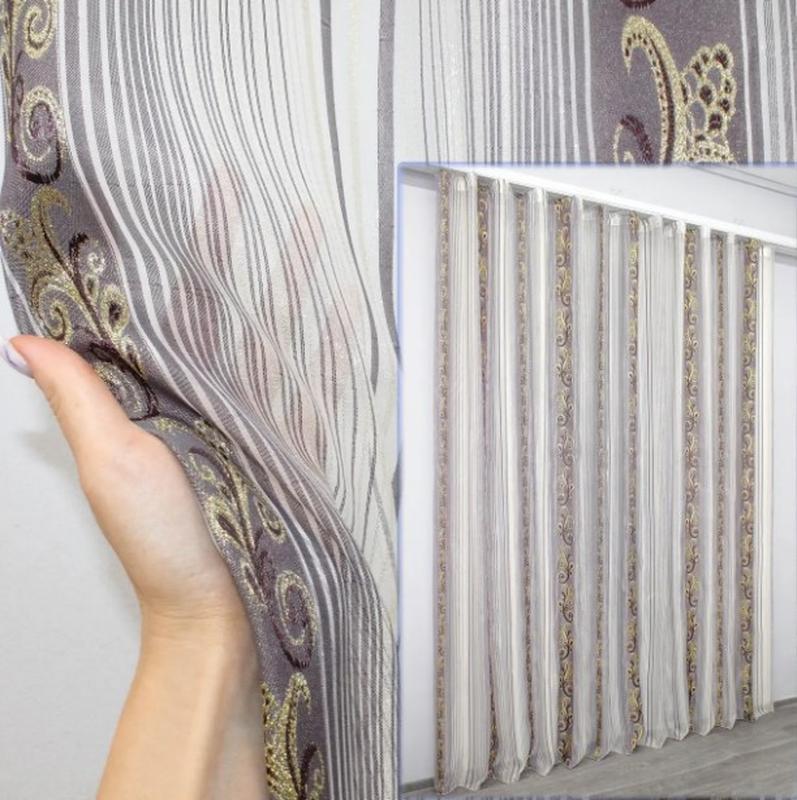 Тюль в вітальню, спальню креп-шифон. колір баклажановий з золотистим