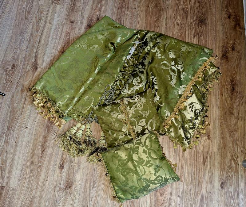Красивые жаккардовые плотные шторы оливкового цвета. Размер 254см. на 143 см. Шторы индивидуальный пошив. Сами шторы в хорошем состоянии, но пришитая тесьма до половины выгорела (чувствовала это только при съемке). Можно отпороть и заменить на другую, или без тесьмы. Прикрывать в отличном состоянии. В подарок 2 наволочки и ламбрекен длиной 293см., из туж ткани но другого цвета.