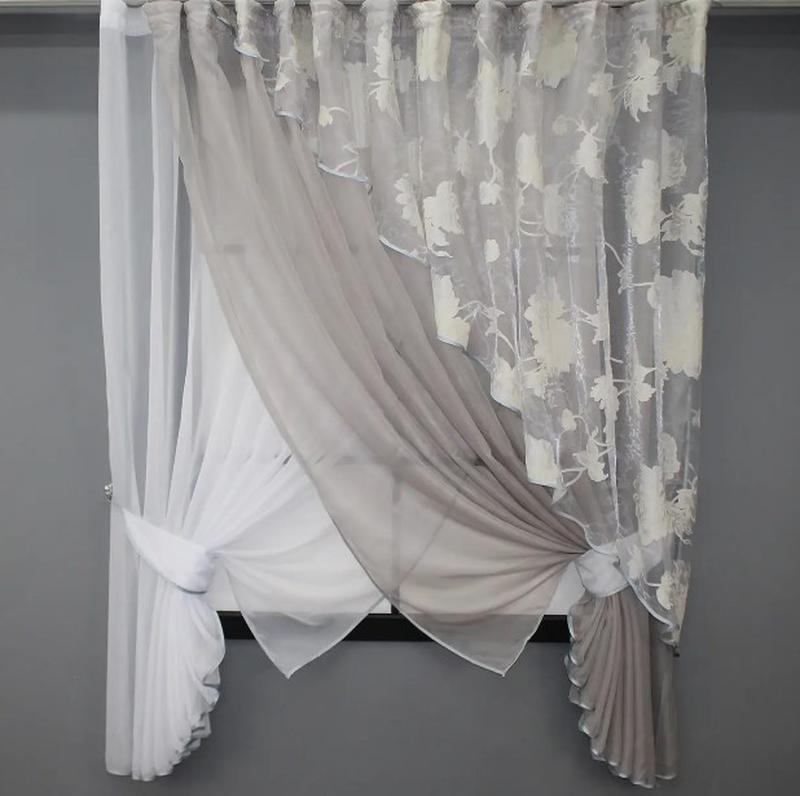 Комплект штор на кухню (300х170см) з підв'язками. колір білий з сірим