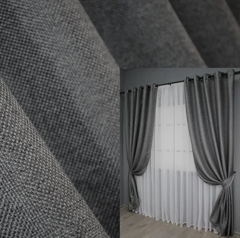 Комплект готових штор з тканини льон блекаут підійдуть до будь-якого приміщення. Особливістю тканини являється гарний захист від сонячного проміння та висока якість, завдяки якій штори не линяють під час прасування. Ширина кожної штори по 1,5м - можемо пошити по Ваших замірах. Тканина - льон-мішковина блекаут, гарно захищає від світла Колір - сірий. Максимальна висота 2.5м