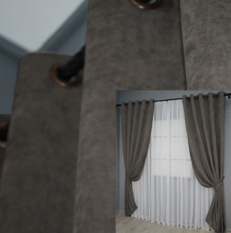 Комплект штор пошитий із якісної тканини - мікровелюр. Вона досить щільна, завдяки чому зберігається теплий мікроклімат у приміщенні. Штори мають гарну стійкість до зношування, приємні на дотик, не вигорають. Комплект штор ідеально підійде для будь-якої кімнати: зали, вітальні, дитячої. Ширина кожної штори 1.5 м, При необхідності ми можемо пошити по ваших вимірах Тканина: мікровелюр Колір: темне какао Висота: 2.5 м Спосіб кріплення: люверси