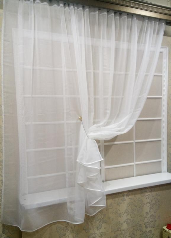 Готовая пошитая занавеска - белый однотонный шифон без утяжелителя. На трубу, трубчатый карниз. Высота - 215 см; Ширина - 250 см.
