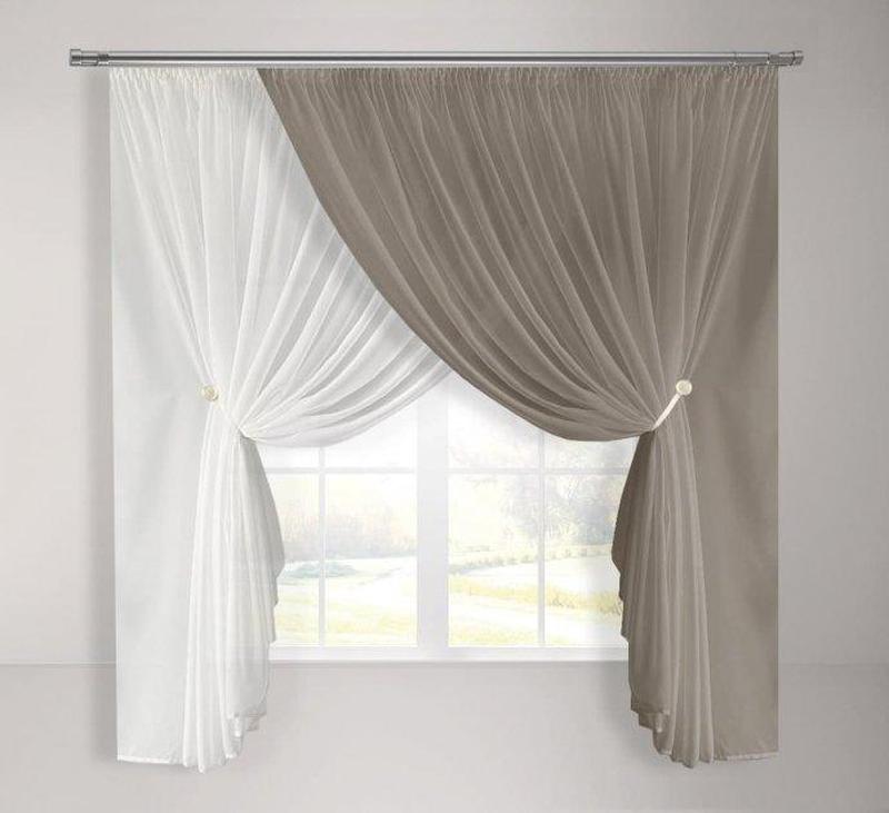 Кухонная короткая шифоновая занавеска тюль с пышной сборкой бело-коричневая в размере 2,8х...