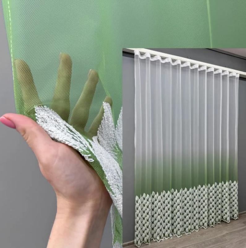 Тюль грек сітка омбре в вітальню, спальню з вишивкою "листочки". колір салатовий з білим
