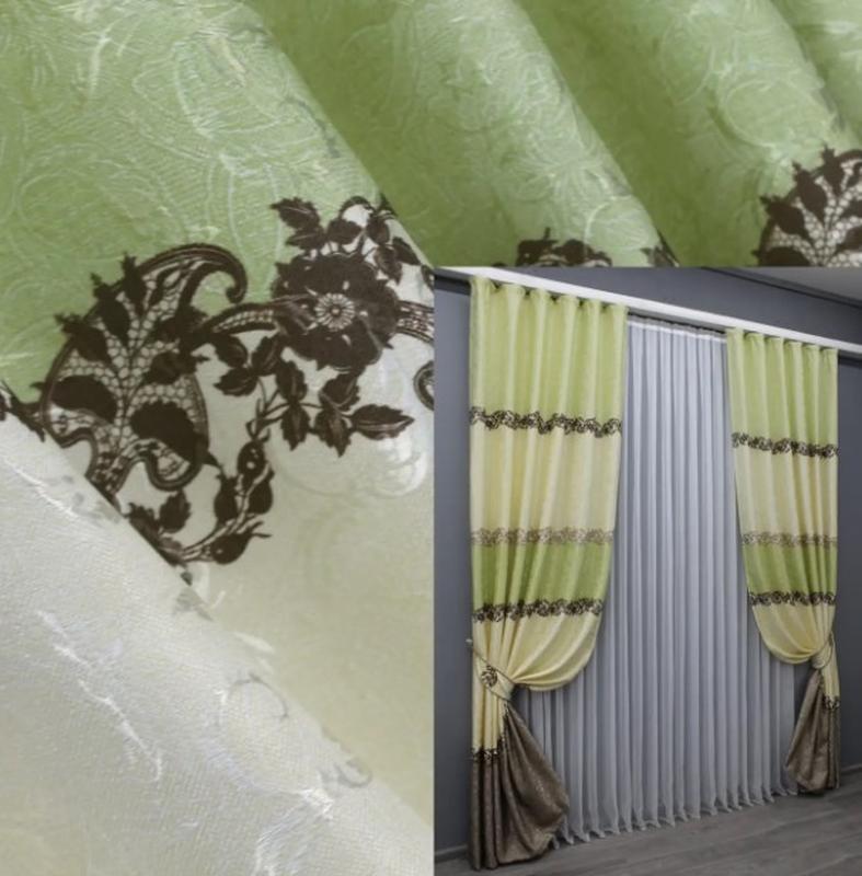 Штори з жакарду (2шт. 1,5х2,7м). колір салатовий з какао та бежевим