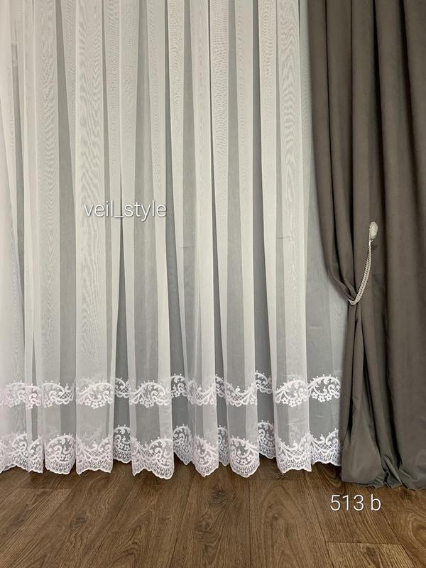 Тюль на основі бамбук білого кольору із вишивкою шиніловою ниткою по низу