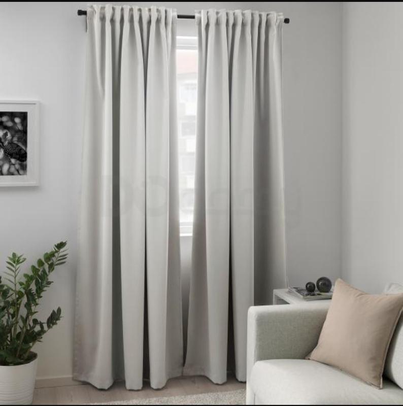 в наличии 1 полотно, светло-серый цвет, блэкаут. Подрезана до высоты 250 см, ширина 140.Крепеж на крючки или карниз-трубу