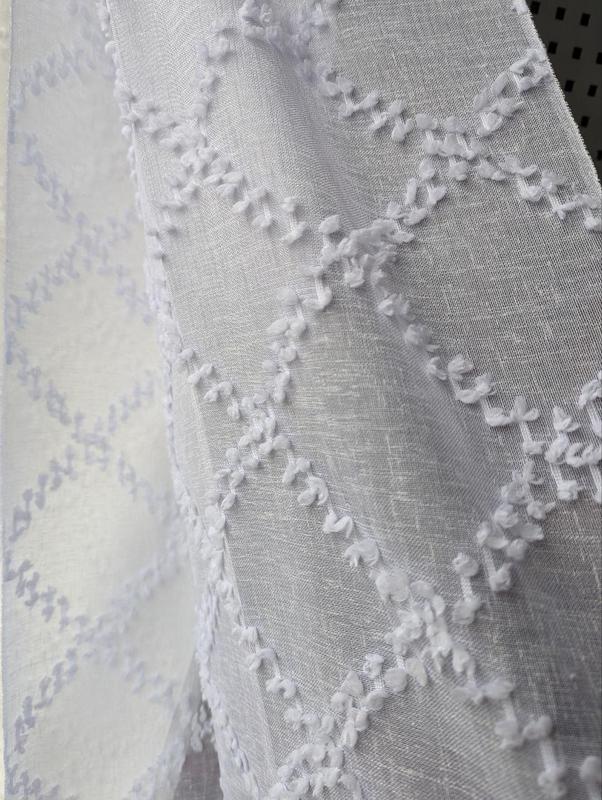 Изысканная белая тюль на основе льна с обьемной вышивкой в виде ромбов, гармонично впишется в дизайн Вашего дома. Выглядит очень нежно. Прекрасно сочетается в паре с шторами так и без штор. Ромб придаст особенную изюминку Вашему интерьеру. Легкая в уходе, пропускает достаточное света и воздуха, не деформируется, доступная цена, высокое качество.
