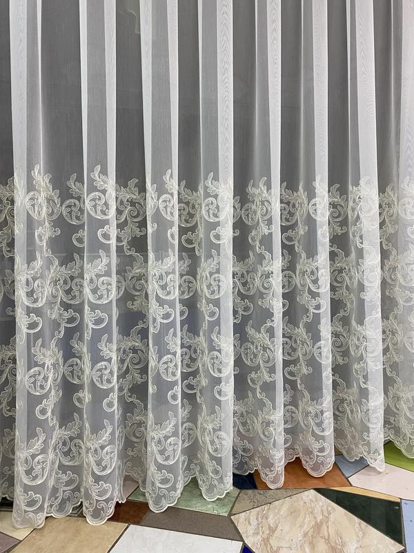 Шикарный тюль на новой основе «бамбук». Тюль отличного качества, с хорошей вышивкой, приятный на ощупь, мягкий, хорошо драпируется и прекрасно пропускает воздух и свет. Цвет: молочная основа+очень светло-золотистая вышивка Высота: 2.80 м. Ткань набирается по ширине окна, в зависимости от размера карниза. Цена указана за метр ширины. Производство: Турция, Kismet textile. Логотип фабрики виден на фото низа ткани. Отправка по Украине.