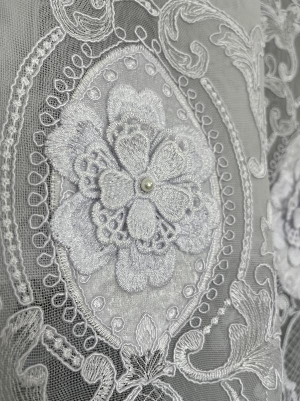 Відріз розкішного тюля на основі бамбук. Тюль розшитий кордовою вишивкою, ґаптований оксамитом та перлами. Основа: бамбук. Колір: білосніжний. Висота тюля 3.0 метри. Ширина відрізу 6.0 м. Виробництво: Туреччина.