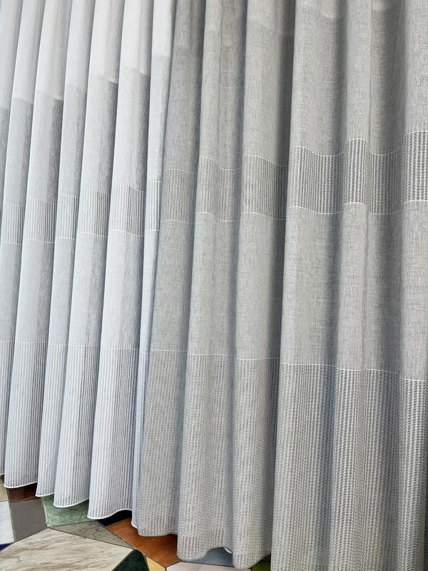 Красивый ненавязчивый тюль на основе льна с горизонтальными полосами мережки. Ткань стильно смотрится на окне и практична в использовании: легко стирается и утюжится, не линяет, не выгорает. Высота полос 1.05 м. Цвет белый, серый и бежевый. Высота 3.15 м. Тюль набирается по ширине окна, в зависимости от размера карниза. На фото тюль собран с коэффициентом 1:2.5 Производство Турция.