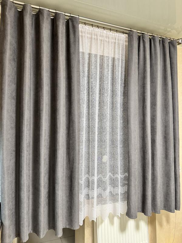 Комплект штор из микровельвета стильного серого оттенка. Цвет ткани хорошо передается на фото вблизи. Ткань легкая, но достаточно плотная, мягкая и приятная на ощупь -- создает уют в комнате и обеспечивает приватность. Тюль в комплект не входит, можно приобрести отдельно. Комплект 2 шторы. Ширина каждой шторы 1.35 м. Высота 1.80 м. Крепление: тесьма (4 см, один ряд петель). *оттенок ткани может отличаться в зависимости от настроек Вашего монитора